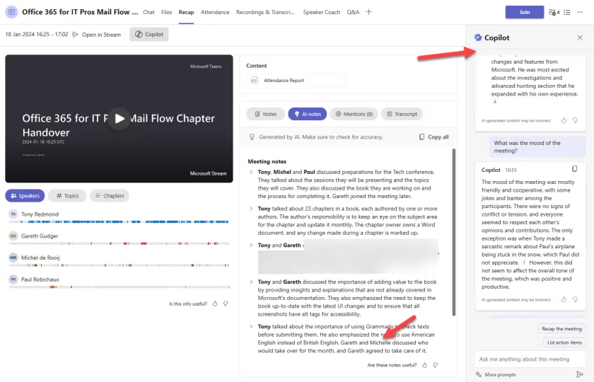 Copilot doesn’t just write down what is said; it understands the meeting. It finds important decisions, notes who said what, points out possible problems, and lists the next steps. If you missed something, just ask, “What were the worries about the budget?” and Copilot will show you exactly when it was talked about.